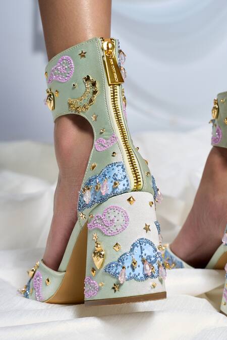 Mint green short block heels featuring rainy cloud motifs and adorned with mini brass heart motifs