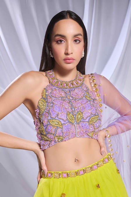 Yellow Tulle Sequins, Zari Halter Neck Berry Sorbet Embroidered Lehenga Set