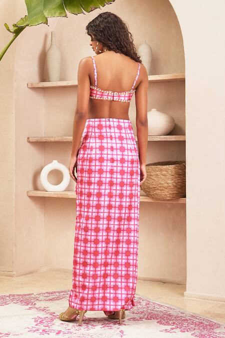 Pink bustier featuring floral heart patterns embellished with sequins and beads. Paired with a matching draped skirt for a cohesive look.