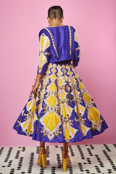 Purple raw silk jacket with 3D embellishments, patchwork using glass beads- pearls, metallic motifs & gold reflective acrylics. Comes with yellow cropped blouse & short lehenga.