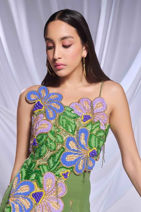 Moss green top featuring hand embroidered 3D flowers, beads, and crystals. Paired with a rhinestone tassels and metal balls embellished georgette gharara.