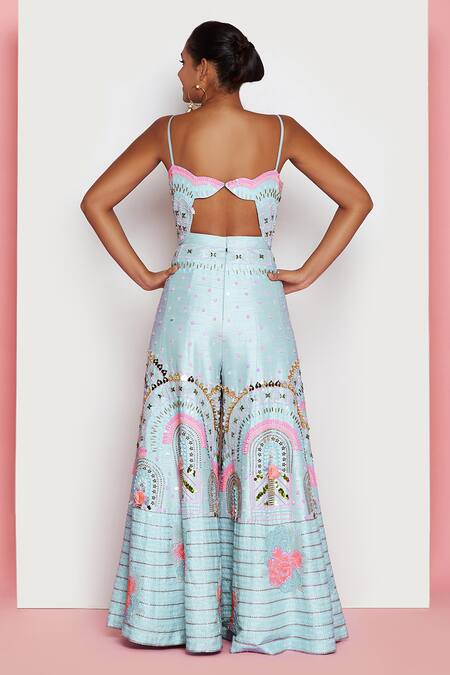 Blue Silk Embroidery, Sequins Sweetheart Neck Love Heroin Flared Jumpsuit