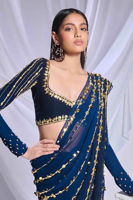 Blue Georgette Pearls, Applique, Zari Midnight Marina Pre-draped Saree Set