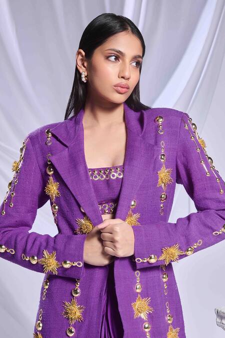 Purple matka silk blazer featuring 3D gold stars embroidery. Paired with an embroidered bustier and a solid draped skirt.