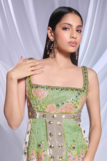 Green velvet gown featuring square neckline, sleeveless design, and embellished with sequins, beads, and patchwork. Paired with a sheer churidar that complements the gown's intricate detailing.