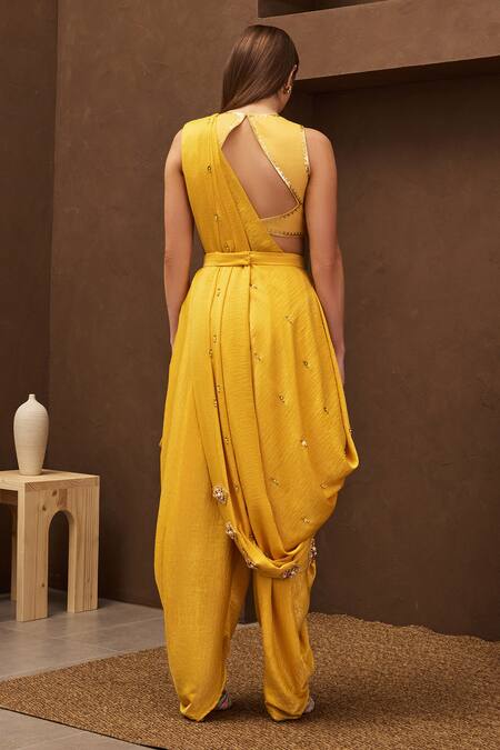 Yellow pre-stitched drape featuring vintage floral embroidery with sequins and beads. Paired with a padded blouse showcasing a motif embroidered neckline and a matching dhoti pant.