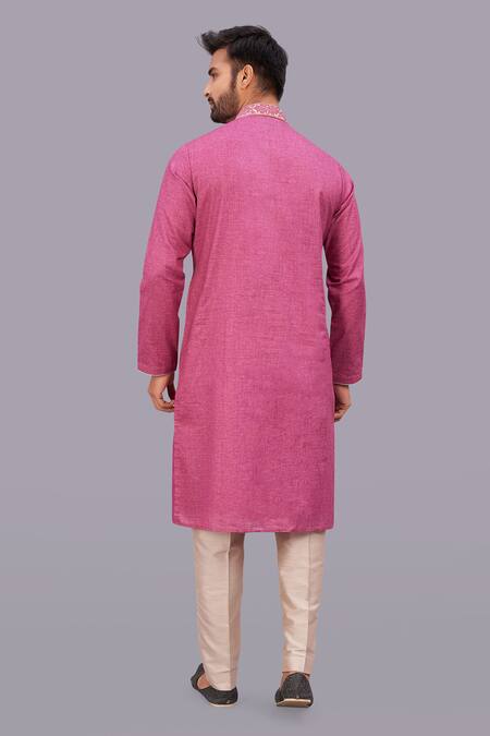 Pink kurta with delicate lace embroidery at the placket and band collar.