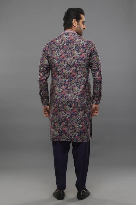 Purple spun silk kurta featuring a floral print design. Paired with a satin linen bundi and muslin salwar for a complete look.
