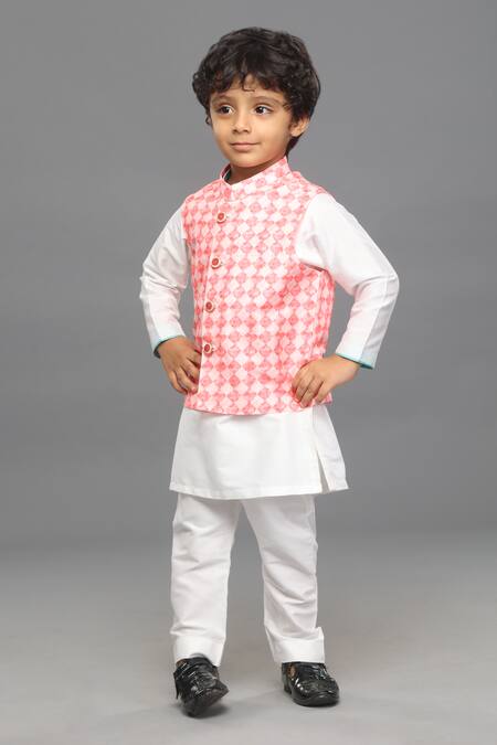 Pink bundi featuring an all-over geometric print and embellished buttons. Paired with an off white full sleeve kurta and pyjama.