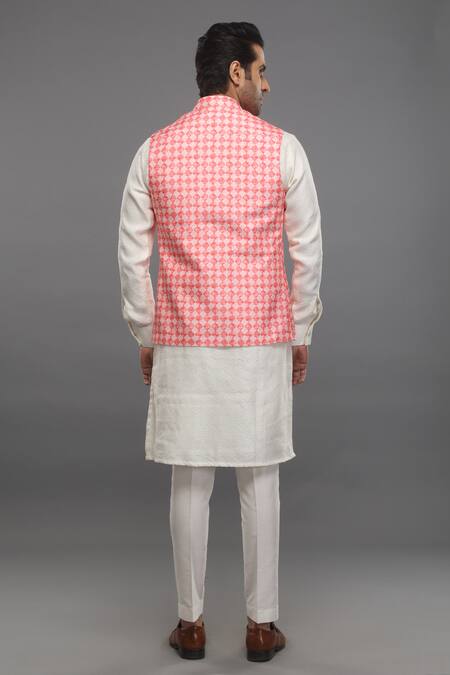 Off-white chanderi silk bundi featuring peach geometric print. Paired with a jacquard kurta and spun silk pant.