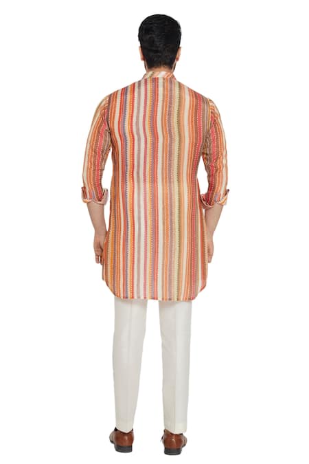 Multi color kurta with stripe print, mandarin collar with embroidered highlights on placket. Paired with contrast pants.