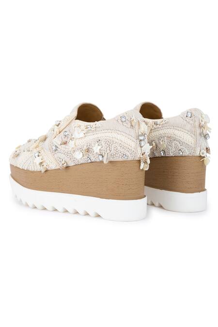 Beige sneaker wedges crafted in moss crepe featuring intricate aari and zardozi embroidery along with shell embellishments