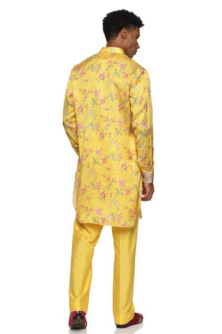 Yellow Satin, Silk Embroidery Floral Print Short Kurta