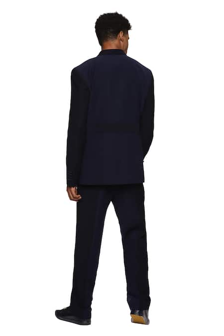 Buy_Paresh Lamba Signatures_Blue Cupro Plain Asymmetric Panelled Lapel Collar Jacket  _at_Aza_Fashions