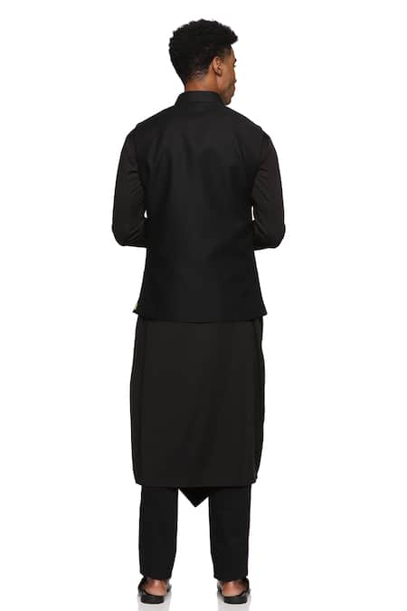 Black bundi featuring floral jaal embroidery and a mandarin collar