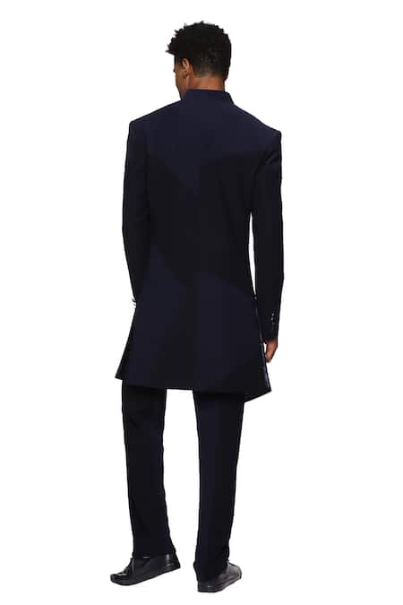 Blue high collar jacket featuring monotoned asymmetric cut patch work panels