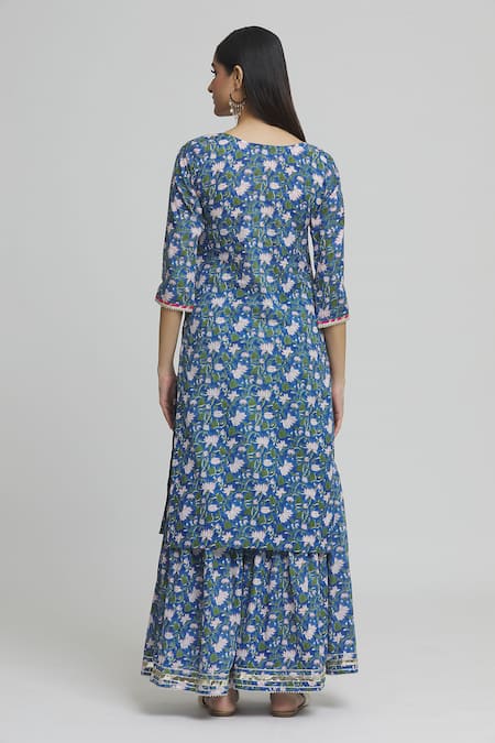 Buy_Samyukta Singhania_Blue Cotton, Voile Embroidery, Tassels Padma Blossom Print Kurta Sharara Set_at_Aza_Fashions