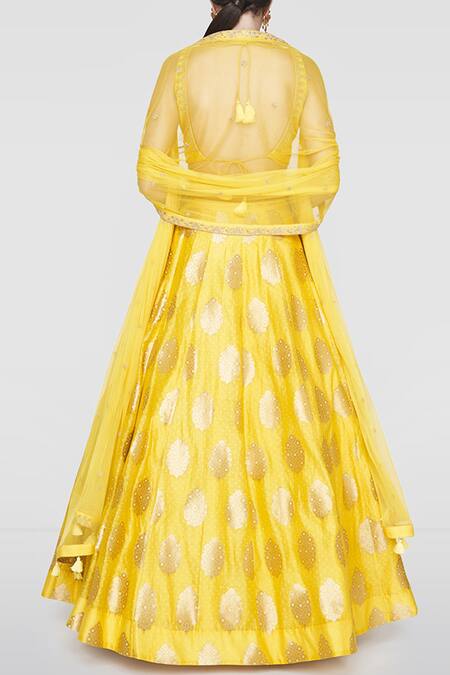 Dressed in motifs of wildflowers and vines from lush Indian forests, the yellow Parina Lehenga is perfect for a destination wedding. This lightweight foil printed lehenga is paired with an embroidered choli and dupatta.