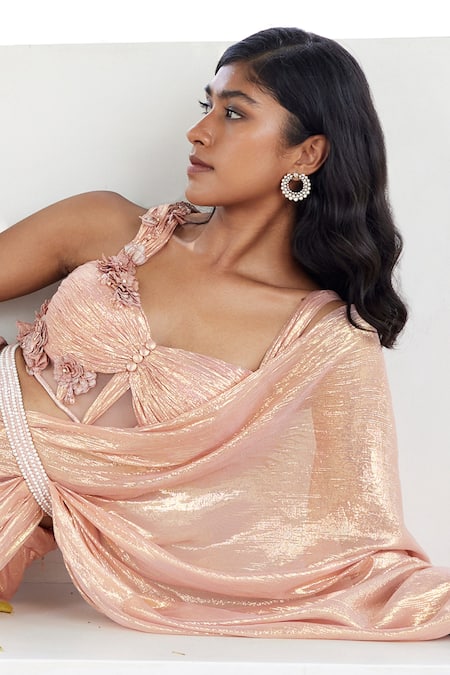 Pink pre-draped saree featuring a metallic shimmery finish. Paired with a sleeveless sweetheart neck padded blouse adorned with 3D floral embellishments and a pearl embroidered belt.