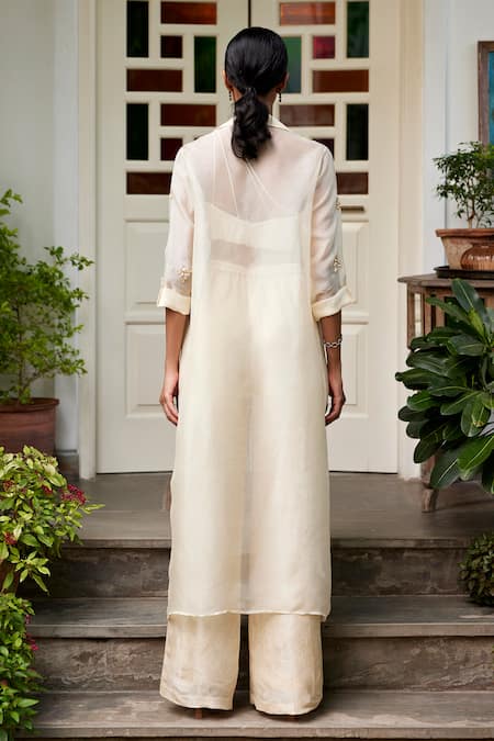 Beige longline organza trench jacket featuring floral bead embroidery. Paired with a one-shoulder embroidered padded blouse and pant made from viscose jacquard.