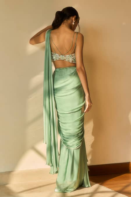Sea green pre-draped saree with bead embellished border. Paired with floral embellished padded blouse.