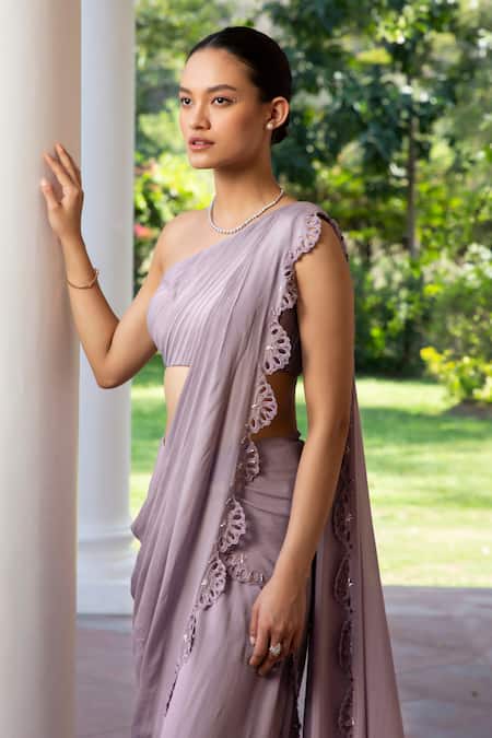 Lavender skirt with saree drape featuring scalloped embroidered hem. Paired with one shoulder ruched blouse.