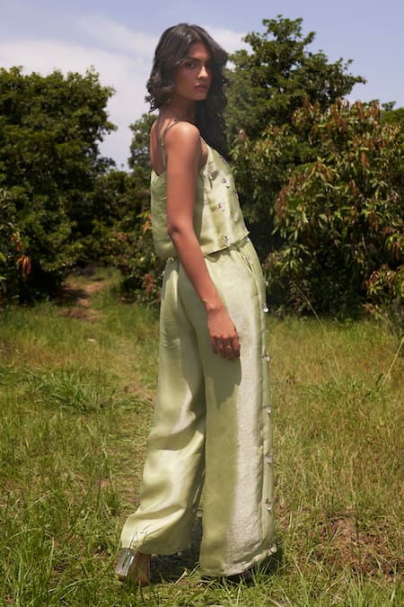 Green top featuring a scoop neckline and sleeveless design with hand embroidery and sequin work. Paired with matching pant that includes side pockets and hand embroidery details.