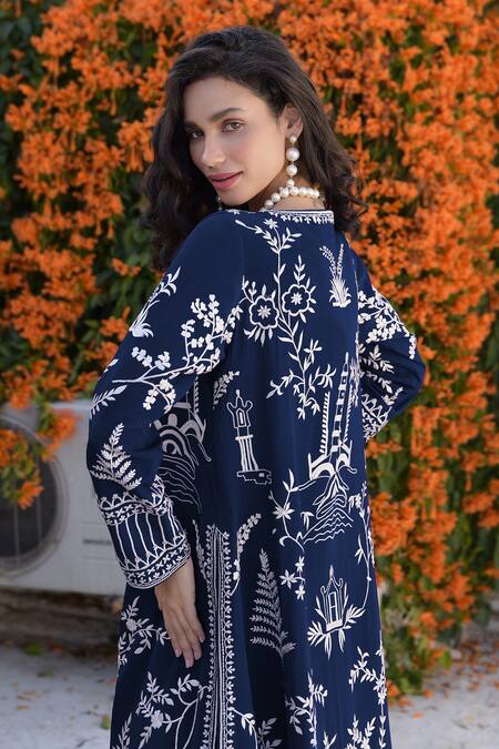 Navy blue jacket featuring ivory parsi gara embroidered motifs. Paired with a micro-pleated blue maxi gown with side zip closure and attached lining.