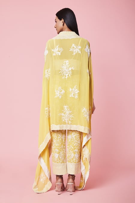 Shop_Sue Mue_Yellow Georgette Resham, Parsi Cape V Neck Work And Pant Set_Online_at_Aza_Fashions