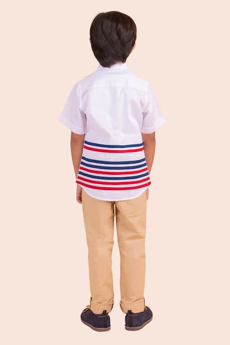 White shirt featuring fish motif embroidery on the front and stripe detailing at the back