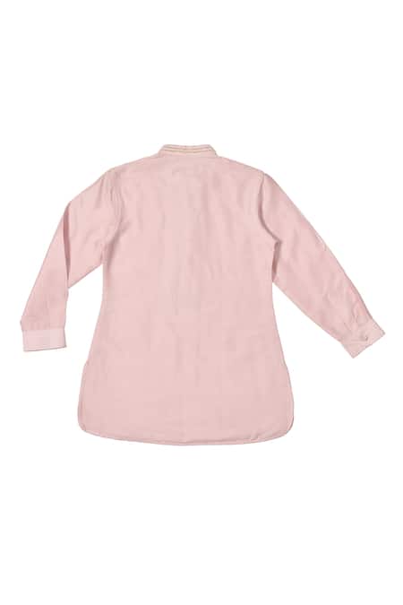 Pink kurta featuring full sleeves with bead, thread, and sequin floral embroidery on the placket. Paired with white pants for a complete look.