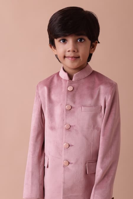 Pink shimmer jodhpuri featuring a stand collar and front button closure. Paired with cotton satin pant for a complete look.