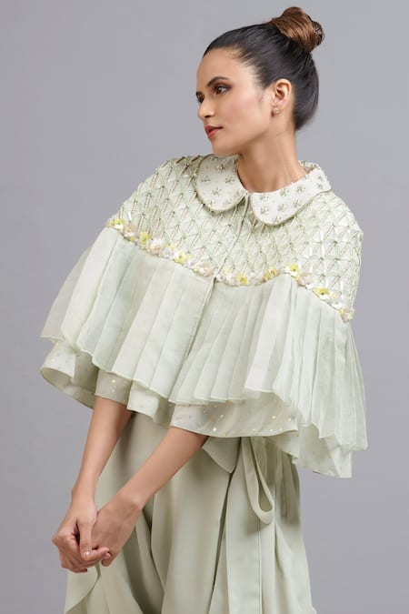 Green Moss Crepe And Organza Peter Pan Collar Draped Jumpsuit With Cape