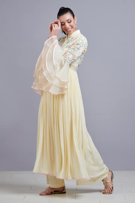 Lemon yellow anarkali with floral embroidery and sequin embellishment. Comes with straight pants and dupatta.