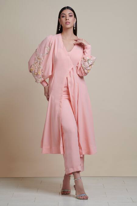 Buy_Parul | Vivek_Pink Moss Crepe V Neck Embellished Cape And Jumpsuit Set _Online_at_Aza_Fashions