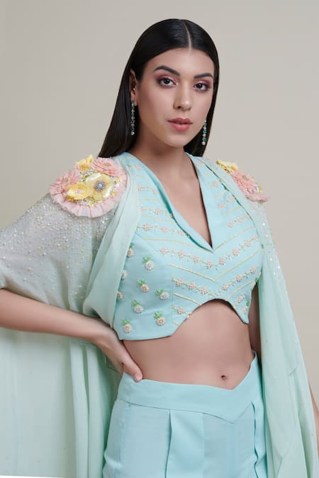 Aquamarine cape with sequin embellishment and floral applique detail on the shoulders. Comes with embellished waistcoat style crop top and pants.