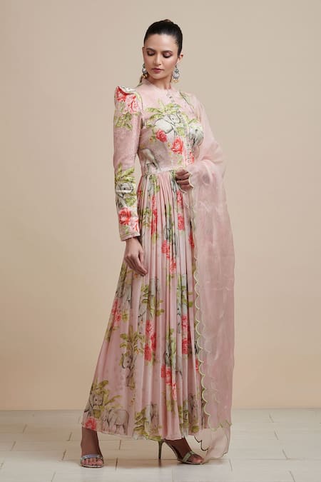 Buy_Parul | Vivek_Pink Anarkali- Georgette, Dupatta- Organza, Lining- Shantoon, Floral Print Set _at_Aza_Fashions