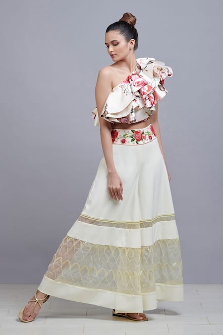 Lemon yellow one shoulder crop top with floral printed motifs and ruffle detail. Comes with flared pants.