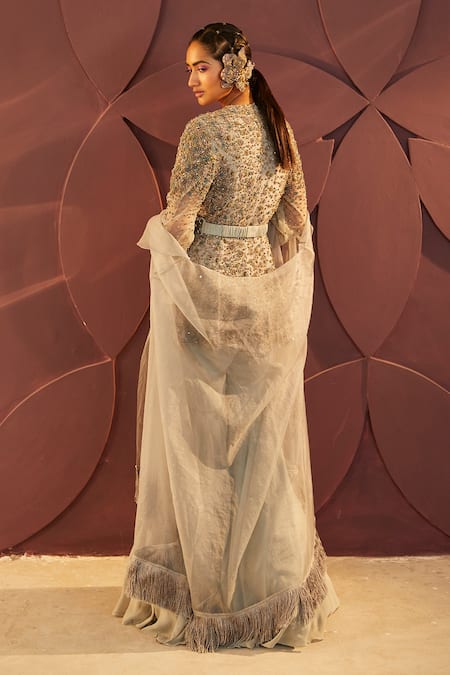 Blue floral embroidered kurta featuring zari, dabka, stones, and thread knots. Paired with a sharara, embroidered belt, and fringe dupatta.