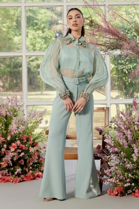 Blue co-ord set featuring a pure silk organza shirt with cording on sleeves and 3D flower and crystals work. Paired with Italian crepe pants and an inner slip.