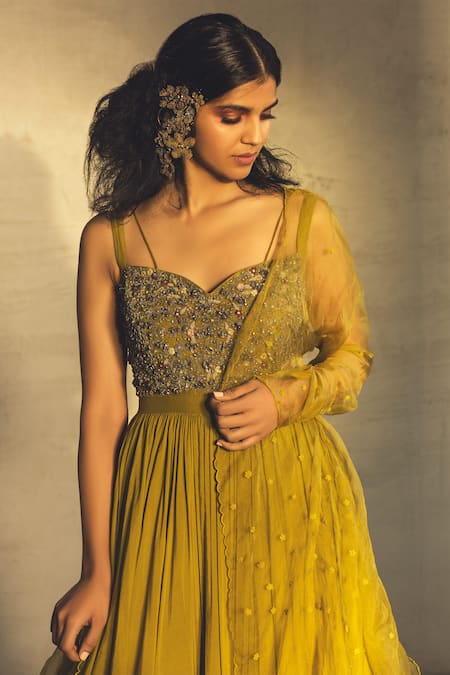 Green anarkali with placement floral motif bead & zardozi work. Comes with one-side jacket dupatta.
