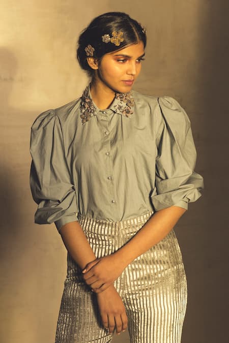 Blue 100% Poplin Floral, Sequin, Thread Band Collar Puffed Sleeve Shirt