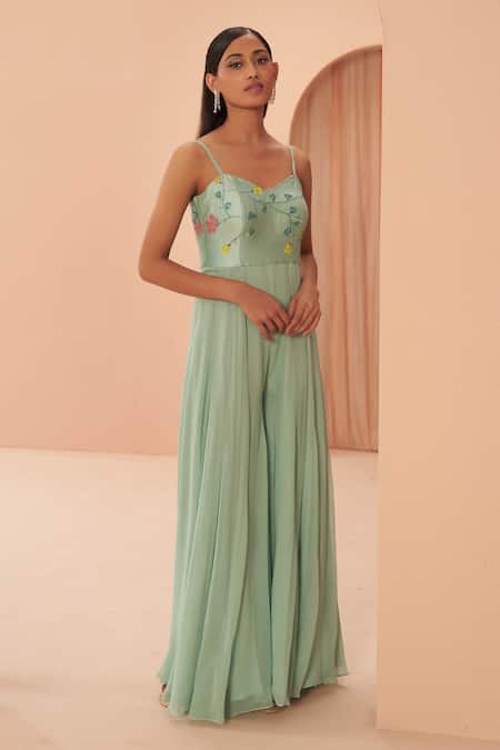 Green jumpsuit with floral hand painted & cutdana embllished motifs.