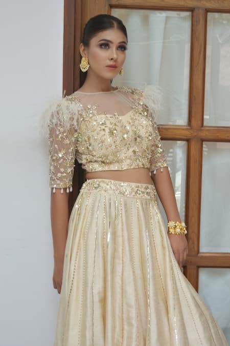Buy_Parul Gandhi_Beige Raw Silk, Mesh Round Embroidered Lehenga Set_at_Aza_Fashions