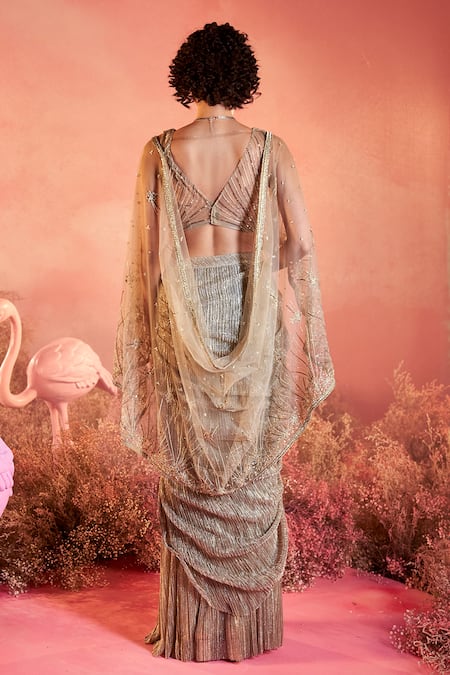 Gold pre-draped saree featuring geometric metallic beads embellished sheer pallu. Paired with a V neck blouse encrusted with beads.
