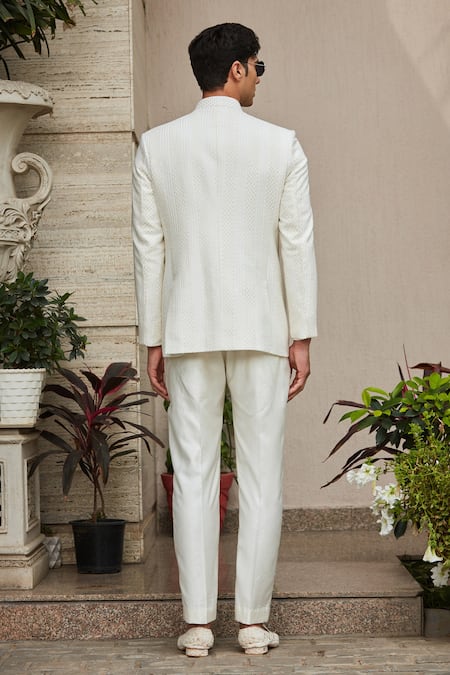 Off white bandhgala jacket featuring chikankari embroidery and a stand collar. Paired with a cotton silk tassar shirt and pant.