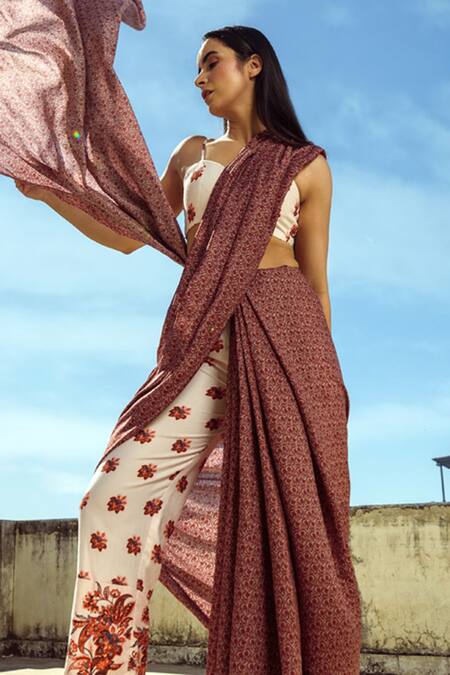 Pink bralette with floral printed motifs. Paired with floral printed straight pant & contrast plum saree.