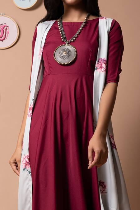 Red flared gown with round neckline and three quarter sleeves. Comes with sleeveless floral print cape.