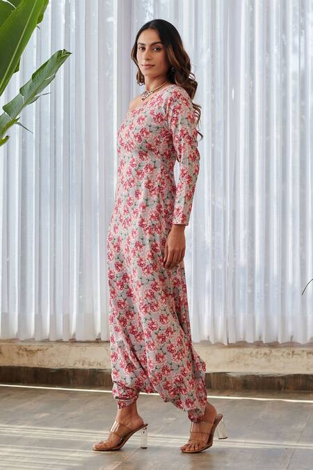 Gray Rayon One Shoulder Floral Dhoti Jumpsuit