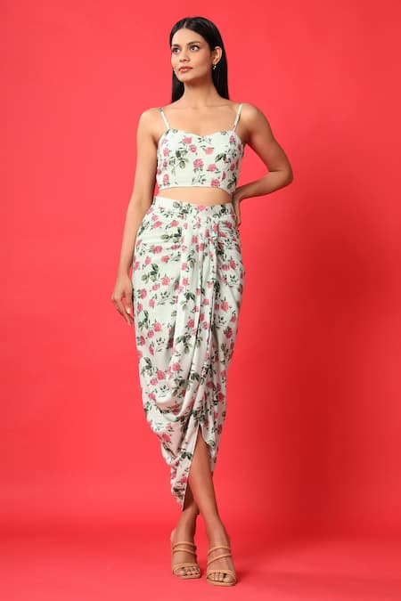 Sage green crop top with floral printed motifs and shoulder straps. Comes with lungi style skirt.